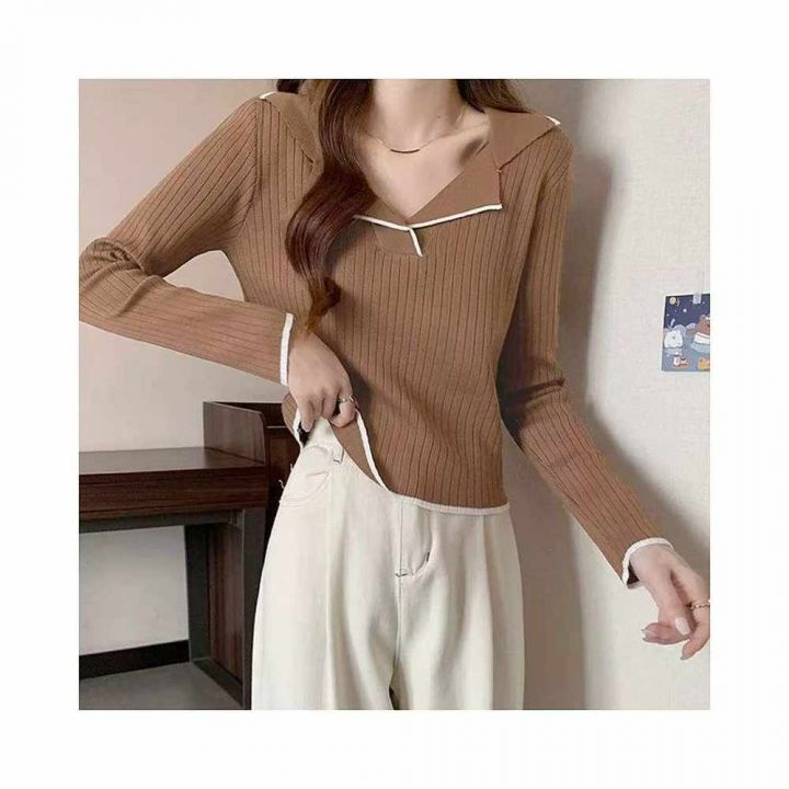 春季新款拼色设计感小众弹力修身显瘦polo领长袖针织毛衣,独立包装,均码面...