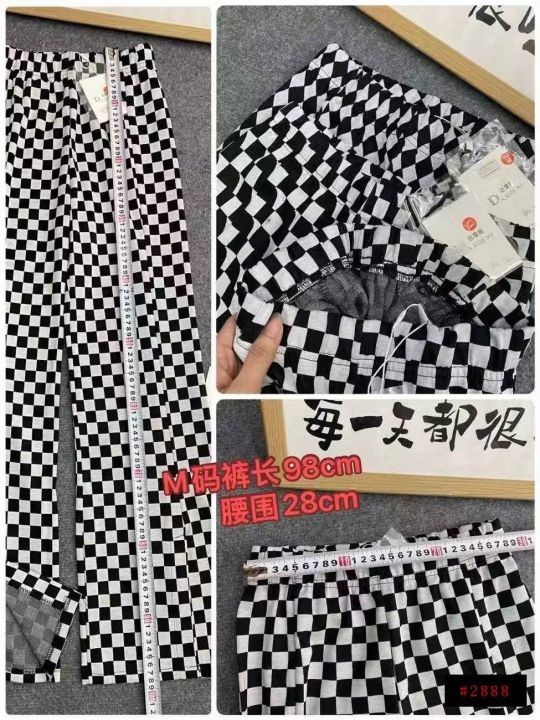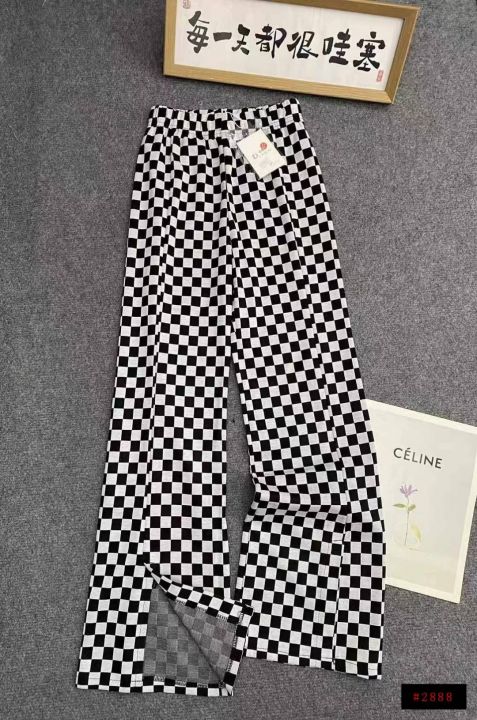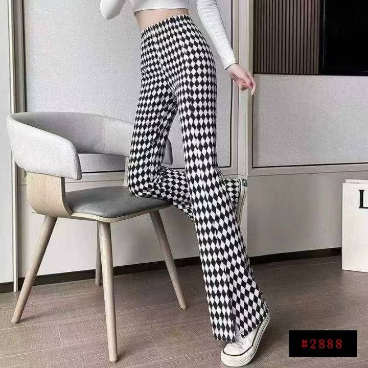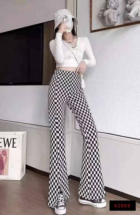 棋盘格子喇叭裤529件8.5,面料微弹,松紧腰,裤脚开叉...