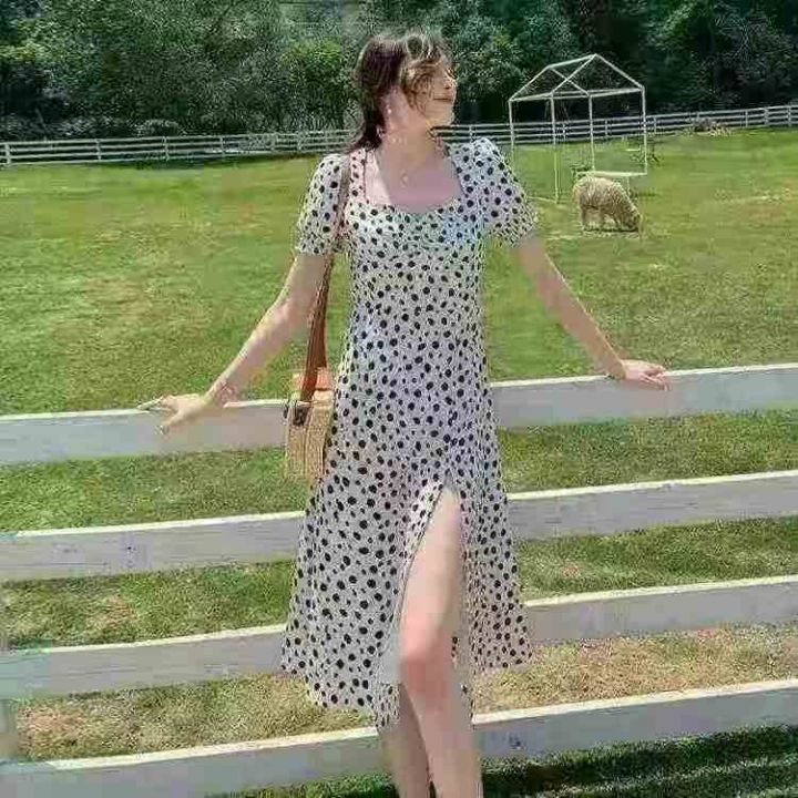 夏装热卖泡泡袖收腰显瘦气质法式复古碎花开叉过膝雪纺中长连衣裙,整款,独立包装,码数L-3XL,L码裙长102厘米,数量207条,(货号0913#41)