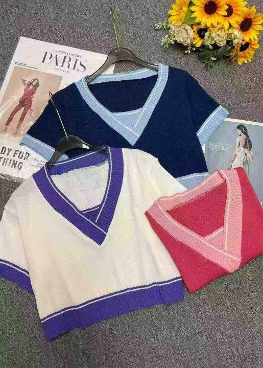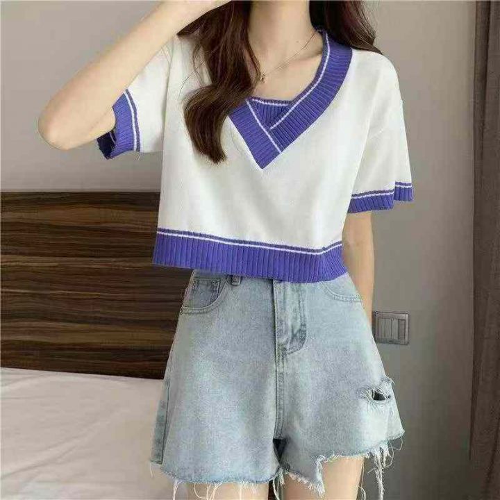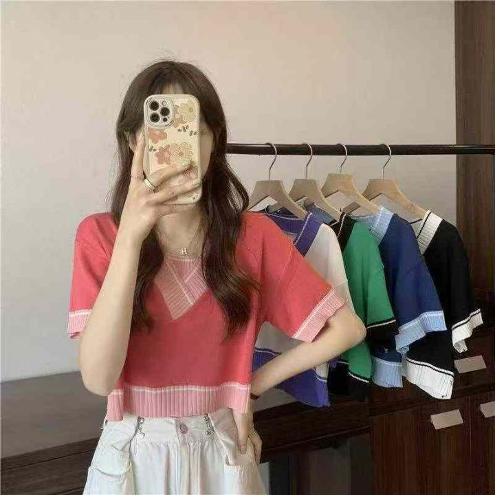 夏季新款港味风假两件V领短款宽松针织短袖T桖,独立包装,均码面料柔软舒适,530件,全清6.9元超低价秒杀!分货加一!。 货号:24862