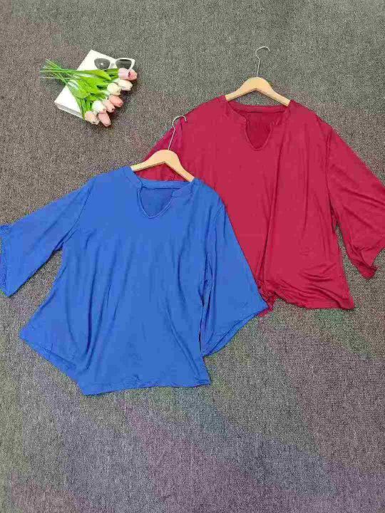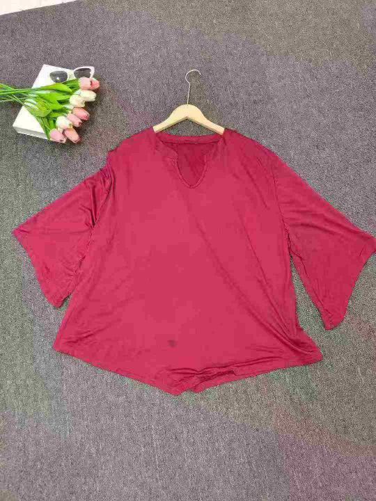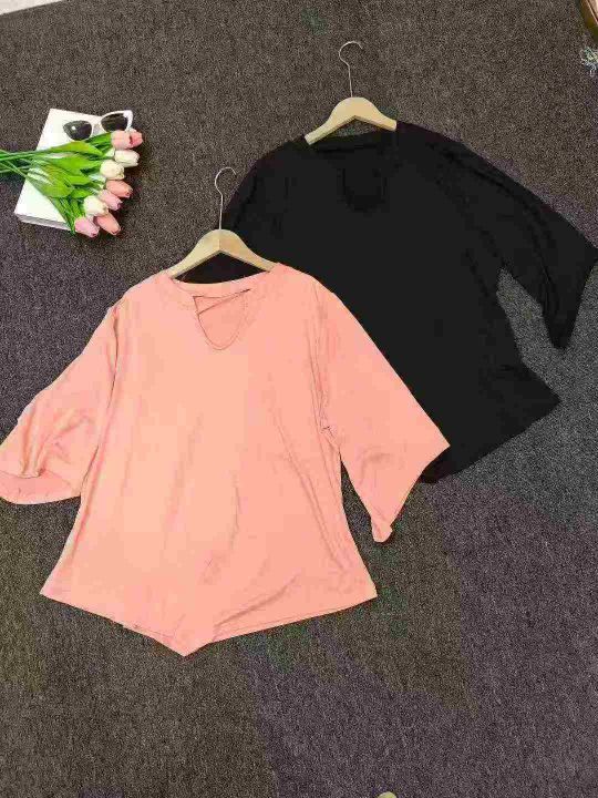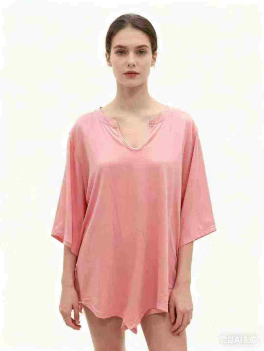 外贸款小V领七分袖T恤女早秋季大码胖mm内搭打底衫不规则上衣