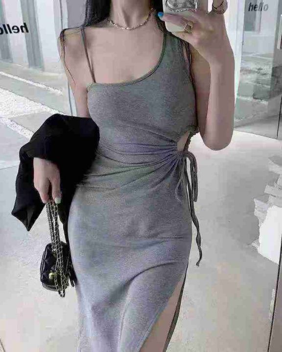 斜肩吊带连衣裙91件6.5,抽褶露腰,下摆开叉设计,肩...