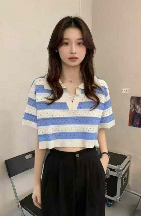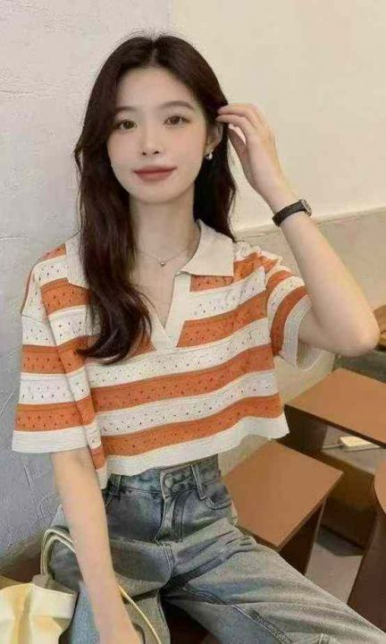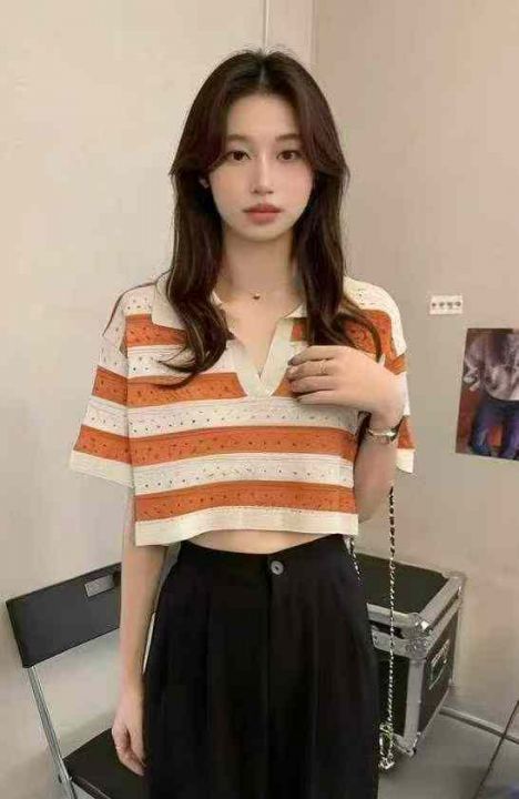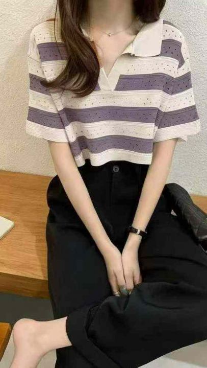 夏季新款撞色条纹短款宽松Polo领针织短袖T桖,独立包...