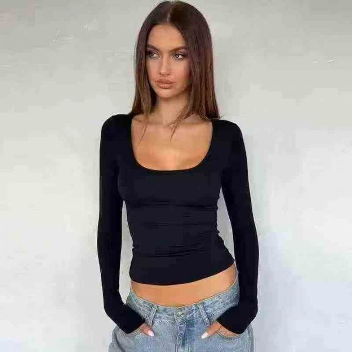 5851件,女早秋季纯色百搭U领长袖T恤上衣女弹力修身高腰显瘦打底衫,一包3...
