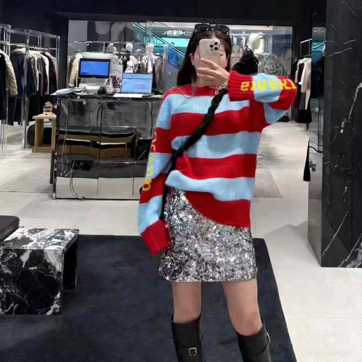 秋冬新款撞色字母条纹圆领针织衫女宽松慵懒风毛衣,独...