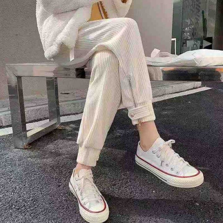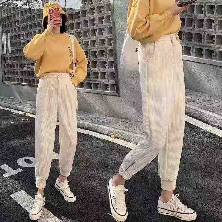 1015条灯芯绒哈伦裤女加绒加厚宽松高腰束脚裤米色休闲...