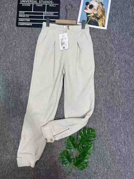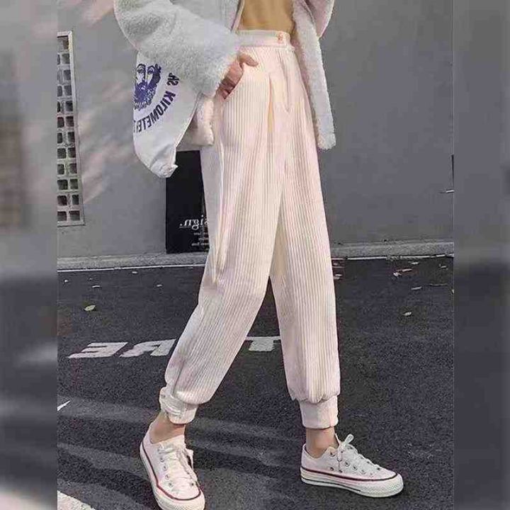 1015条灯芯绒哈伦裤女加绒加厚宽松高腰束脚裤米色休闲...