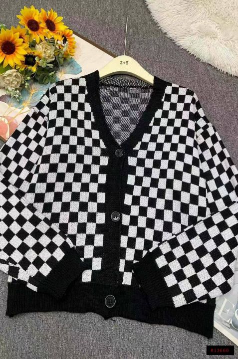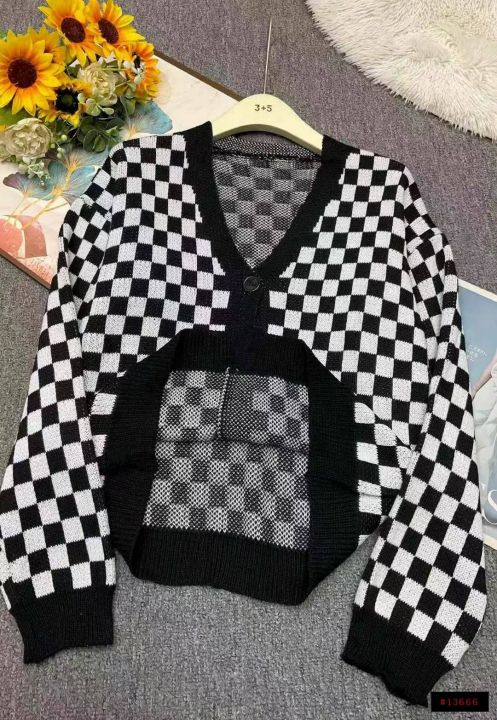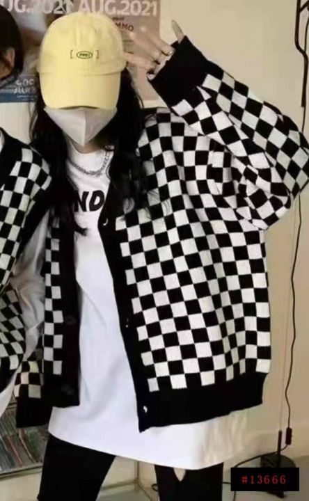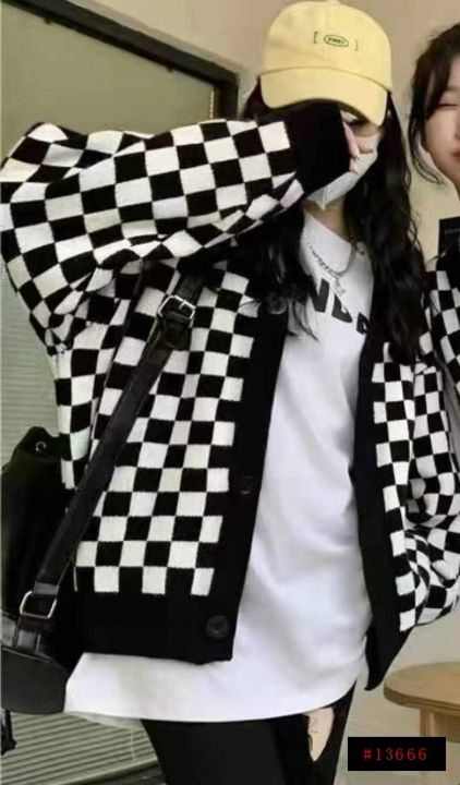 春秋新款宽松百搭网红爆款纯棉棋盘格毛衣开衫,独立包...