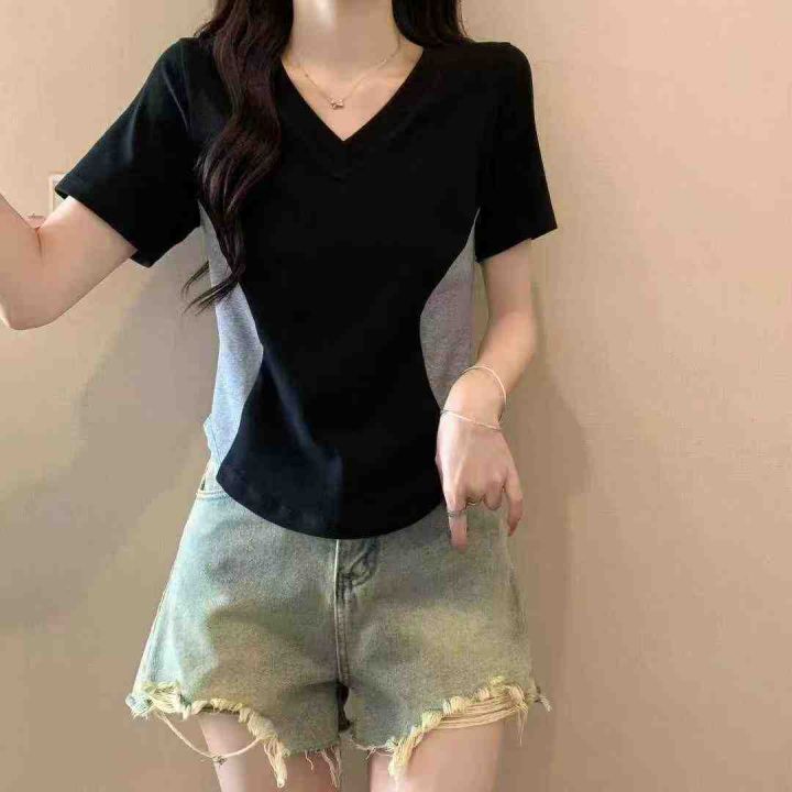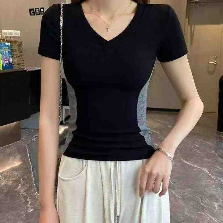 甜辣V领设计感撞色拼接修身显瘦上衣,[爱心]130件左右,款号#1040,码数S-XL,穿70-120斤,万佳档口货,原包装️无瑕疵,[666]实体店品质