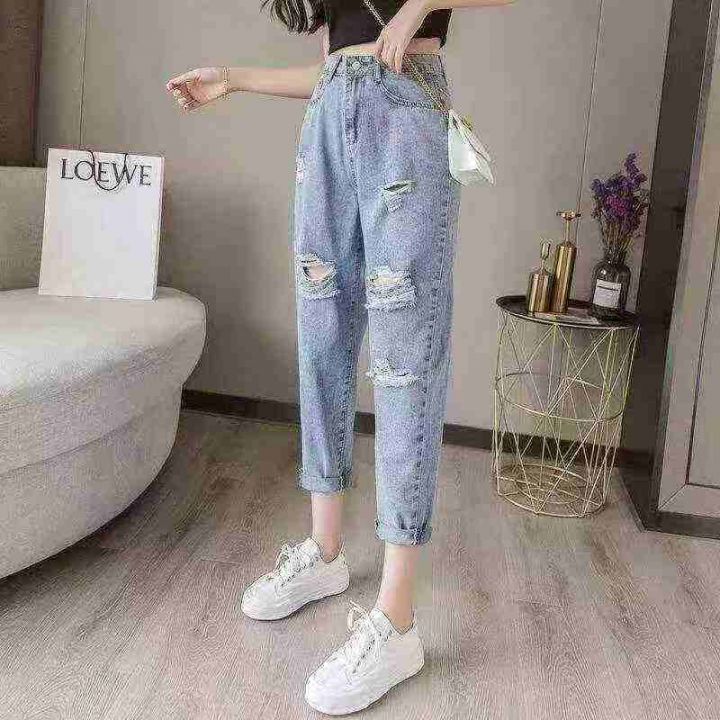 春夏季新款复古破洞微胖MM高腰宽松显瘦半松紧腰哈伦牛仔老爹裤,独立包装带...