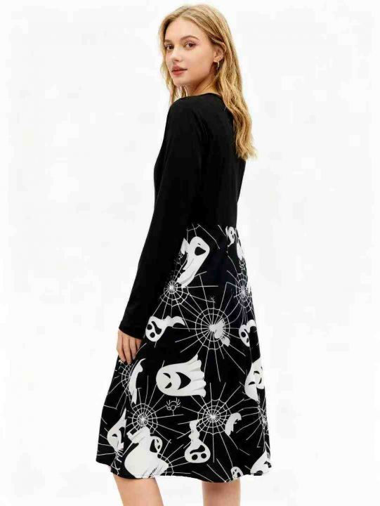 跨境电商赫本复古万圣节印花长袖大摆连衣裙送丝带,独...