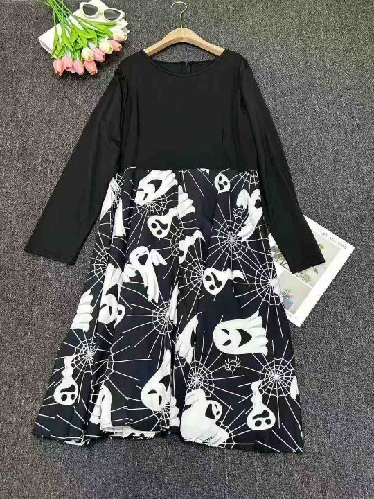 跨境电商赫本复古万圣节印花长袖大摆连衣裙送丝带,独立拉链包装,410件,XL-4XL,全清8.8。 货号:24862