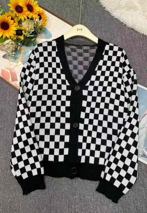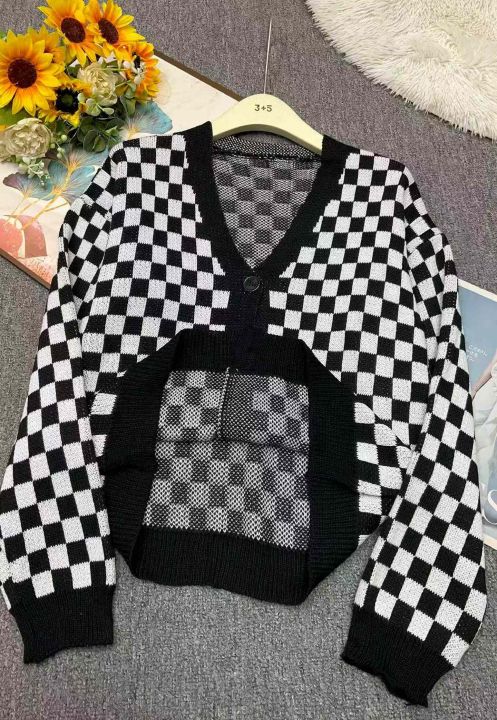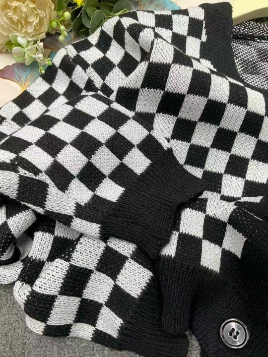 春秋新款宽松百搭网红爆款纯棉棋盘格毛衣开衫,独立包...