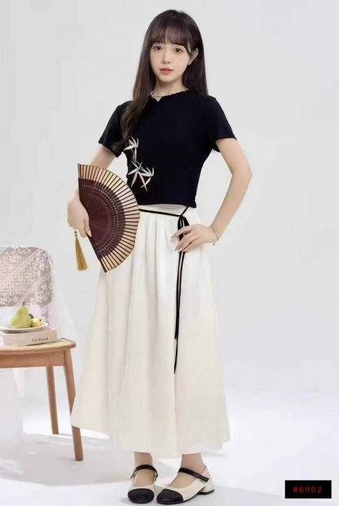 [月亮]:新中式刺绣绑带设计辣妹包边T恤