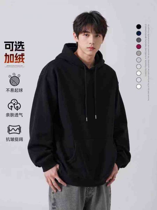 ☕️美式重磅纯色加绒连帽卫衣男女秋冬宽松加绒情侣纯...