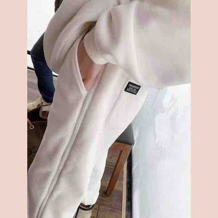 405条白色休闲高腰加绒裤子女装秋冬季直筒束脚卫裤,整款3个颜色,独立包装,码数S一XL,纯棉加婴儿绒很厚实,重工拉链边装饰,全清11.8分货加1