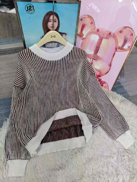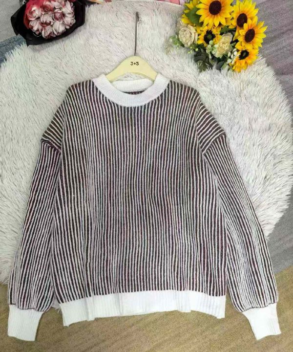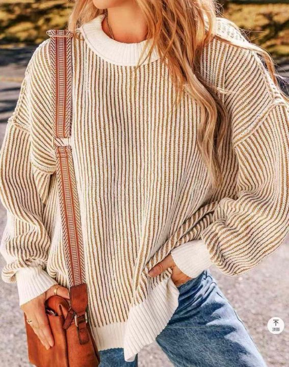 秋冬新款撞色条纹宽松慵懒风加厚北极绒套头毛衣,独立...