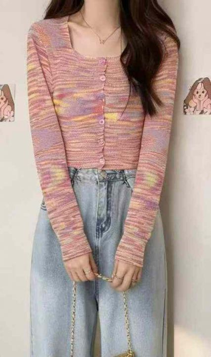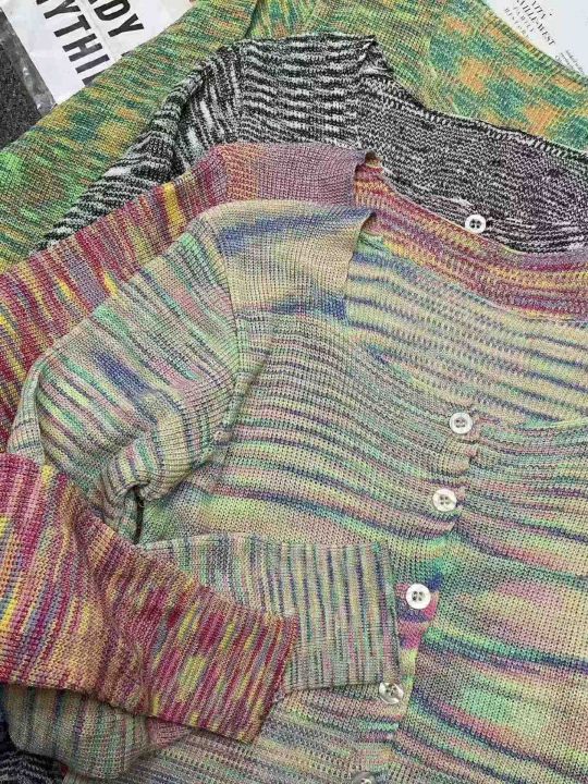 春秋新款网红复古撞色彩虹条纹针织毛衣开衫,独立包装...