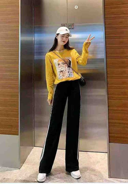 天猫精选300条 秋冬款高腰阔腿黑色字母条纹运动休闲加...