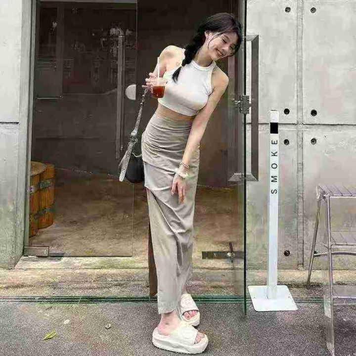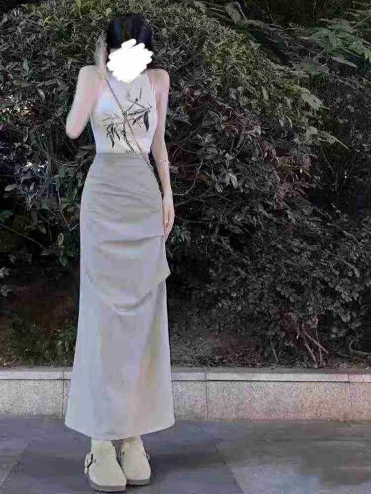 褶皱半身裙女夏季中长裙修身显瘦速干开叉半裙欧美ins...
