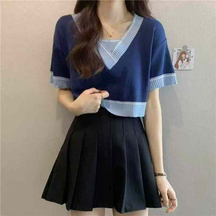 夏季新款港味风假两件V领短款宽松针织短袖T桖,独立包...