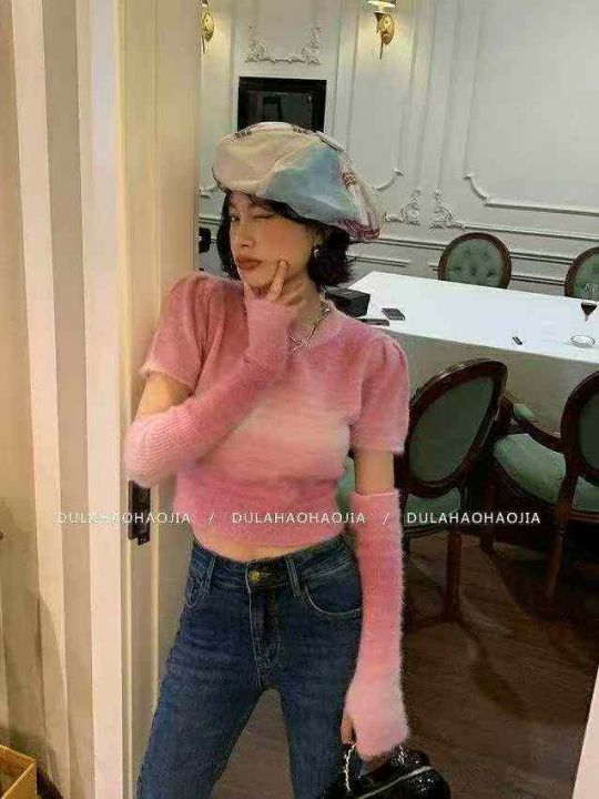 春秋新款网红复古撞色彩虹条纹氛围感穿搭可拆卸长袖短款针织套头毛衣,独立...