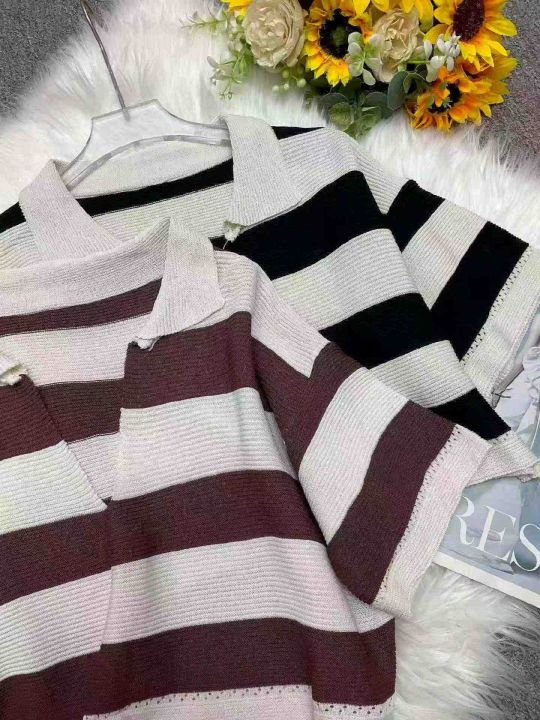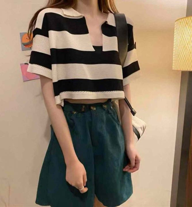 夏季新款撞色条纹宽松短款Polo领针织短袖,独立包装,...