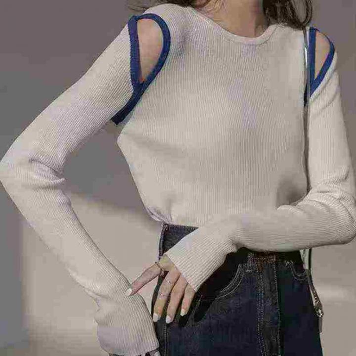 针织撞色镂空修身上衣女秋冬百搭显瘦可外穿内搭毛衣,整款2色,S-5XL码,弹...