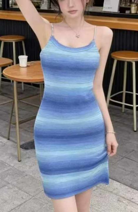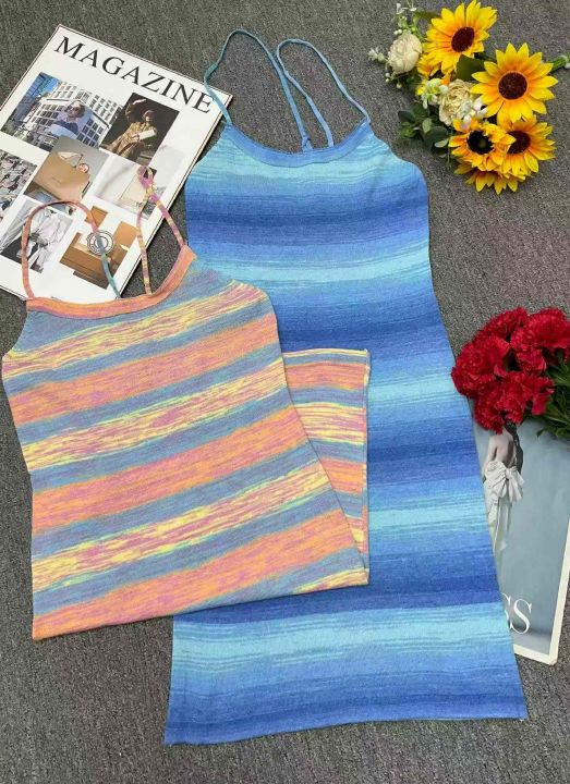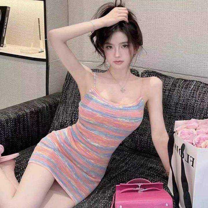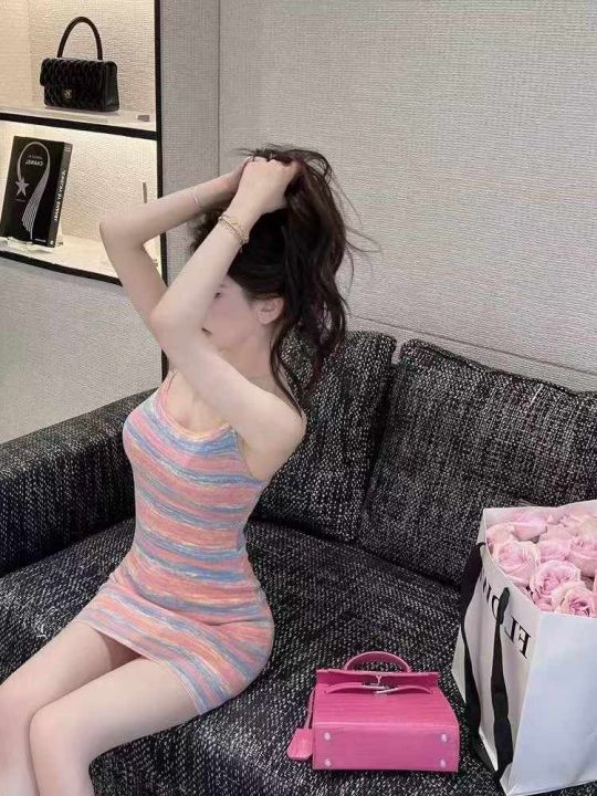 夏季新款撞色彩虹条纹辣妹性感针织吊带连衣裙,独立包...