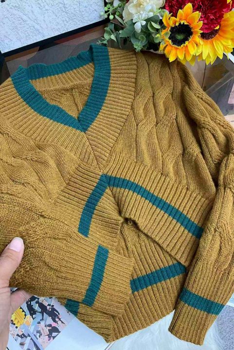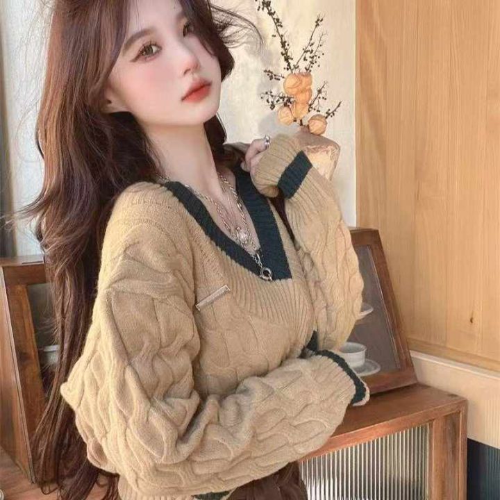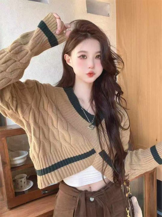 秋冬新款爆款慵懒风加厚麻花宽松短款设计感v领针织套...