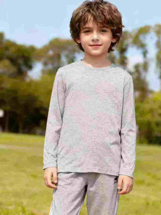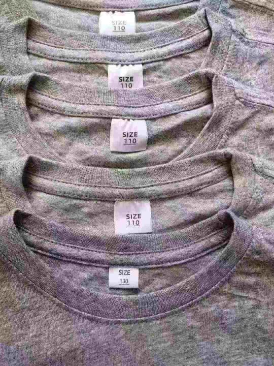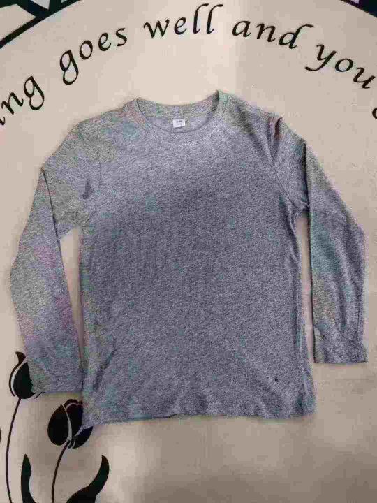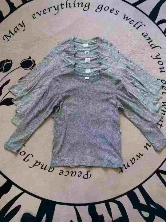 灰色纯棉光板儿童长袖T恤,数量1100件左右,尺码110.130两个码,110多,后领包边到肩,十件一包装。