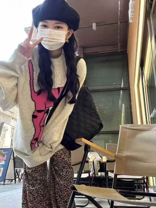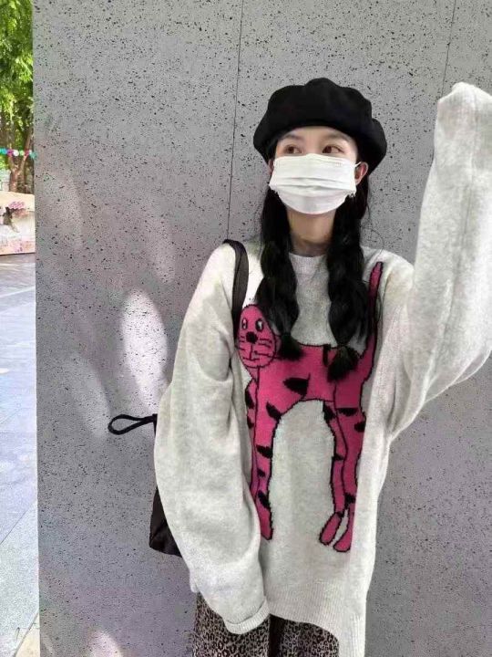 100件秋冬款韩版卡通小猫咪提花,慵懒学院风套头宽松设计针织毛衣,新款百搭,独立包装