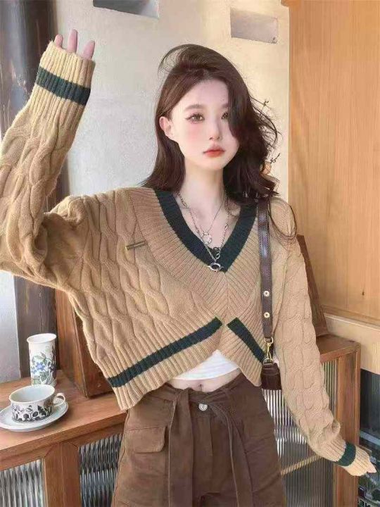 秋冬新款爆款慵懒风加厚麻花宽松短款设计感v领针织套...