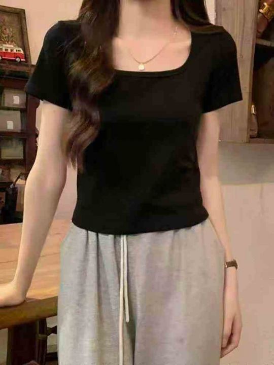 ☕️韩版正肩方领露锁骨短袖t恤女夏季修身显瘦u领短款上衣800件全清7.8元 ...