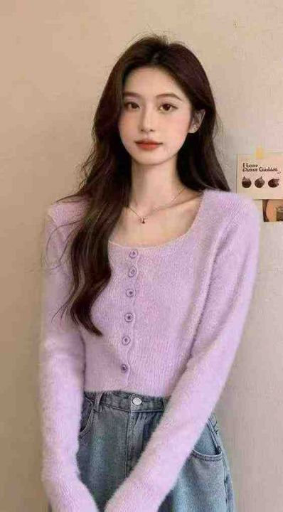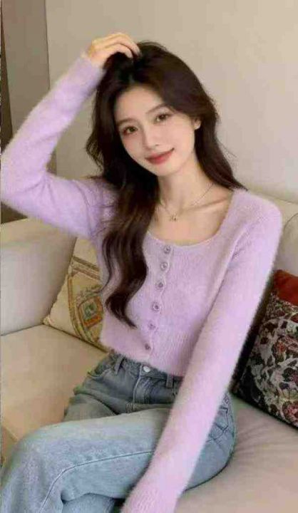 春秋新款法式复古紫色方领高级感弹力修身显瘦水貂毛针织毛衣开衫,独立包装,均码面料软糯舒适,100件,全清7.9元超低价秒杀!