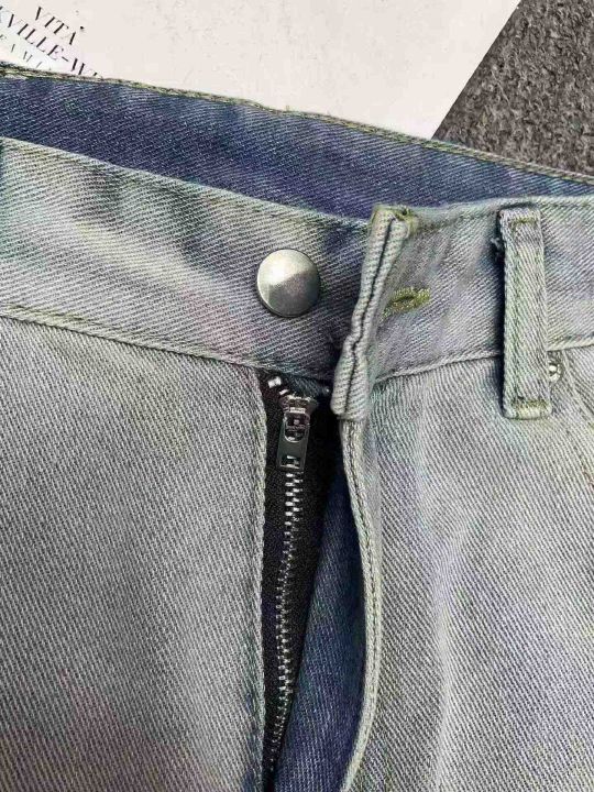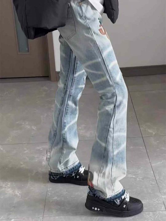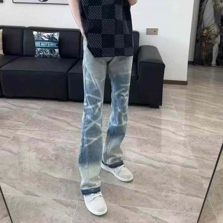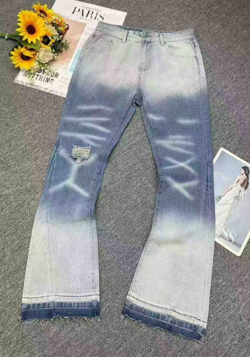 春秋新款网红美式复古水波纹渐变色刺绣毛边微喇叭男女同款宽松牛仔裤,独立包装带吊牌,码数L--3XL码(码数清单看图),320件,全清9.9元超低价秒杀!分货加一!