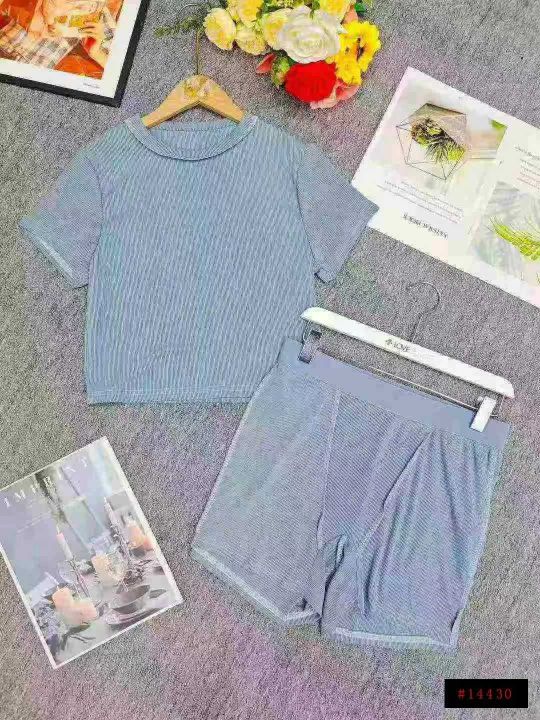 3.9清工厂回收262件外贸热卖设计感时尚套装雾霾蓝短袖...