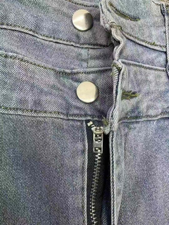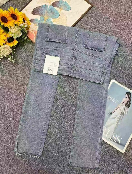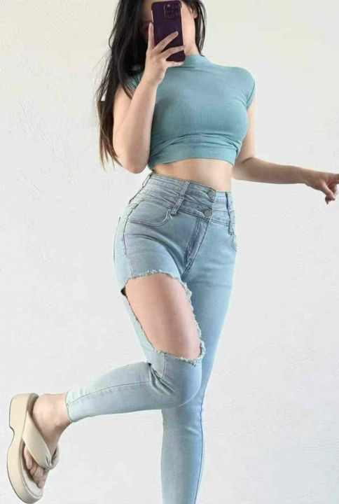 春夏季新款高弹力女装洗水棉设计款破洞牛仔小脚裤,独...