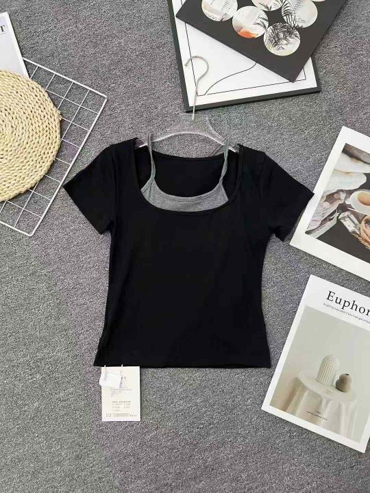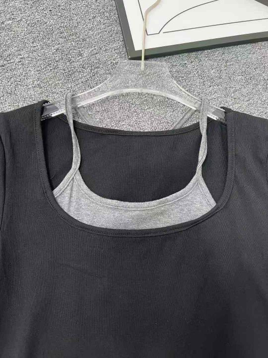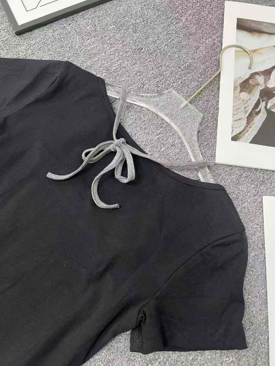 ☕️美式甜辣妹黑色挂脖短袖t恤300件全清8.8元,单款黑色,S到XL码数,独立包装。纯棉修身收腰设计感短款假两件上衣