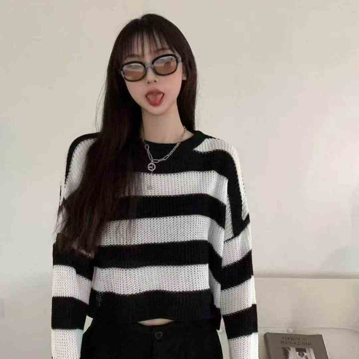 捡漏款,早秋新款靓妹短款宽松撞色黑白条纹针织长袖小衫,有垫肩,均码面料...