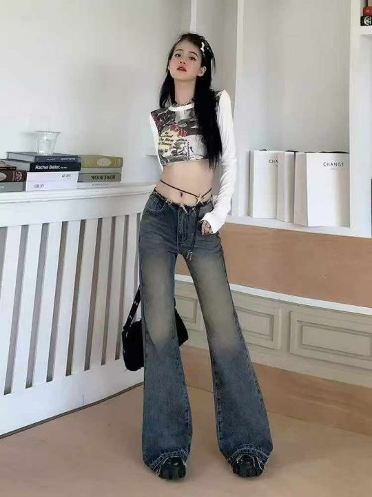 春秋新款辣妹复古阔腿喇叭牛仔裤,独立包装带吊牌,码...