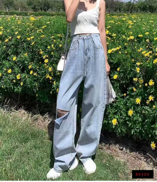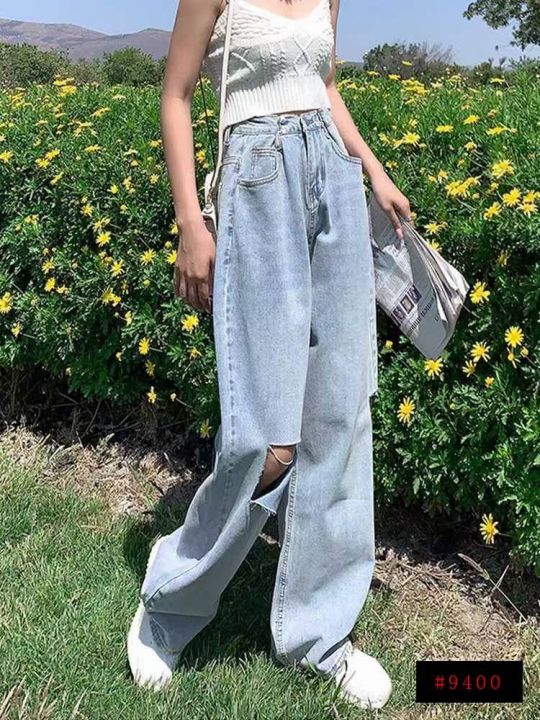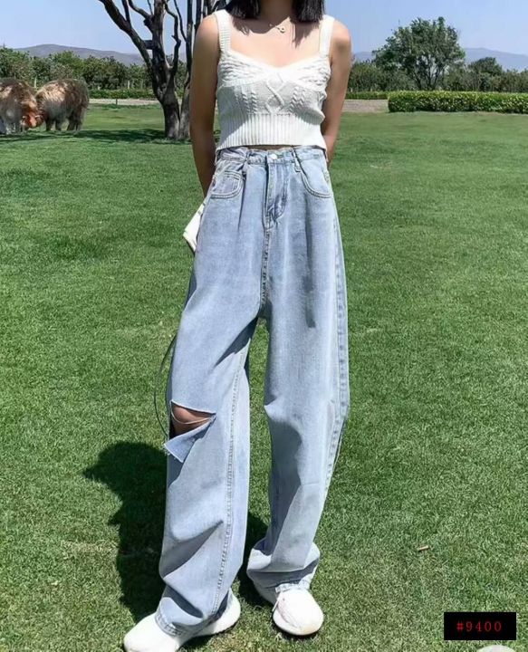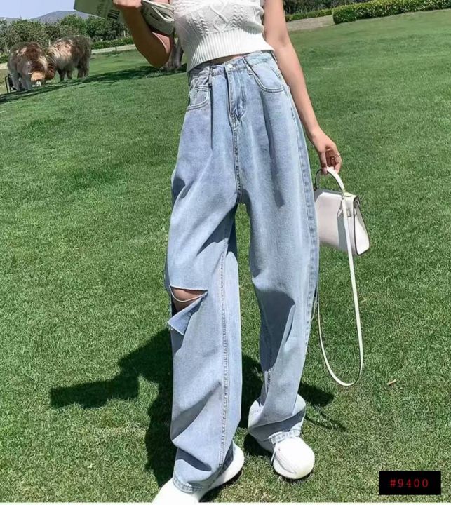 春秋新款复古网红破洞可调节直筒阔腿牛仔裤,独立包装...