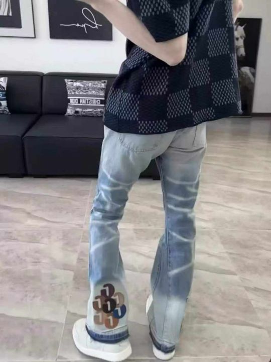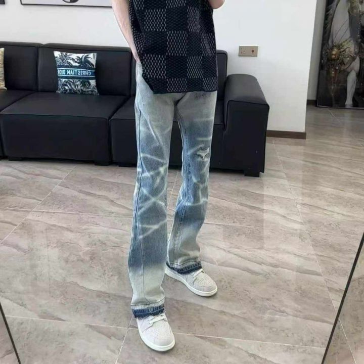 春秋新款网红美式复古水波纹渐变色刺绣毛边微喇叭男女同款宽松牛仔裤,独立包装带吊牌,码数L--3XL码(码数清单看图),320件,全清9.9元超低价秒杀!分货加一!