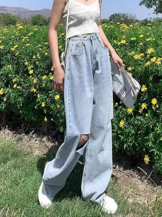 春秋新款复古网红破洞可调节直筒阔腿牛仔裤,独立包装...