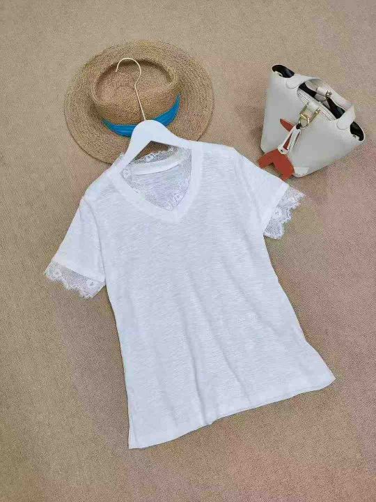 [月亮]:美式设计感蕾丝拼接休闲短袖