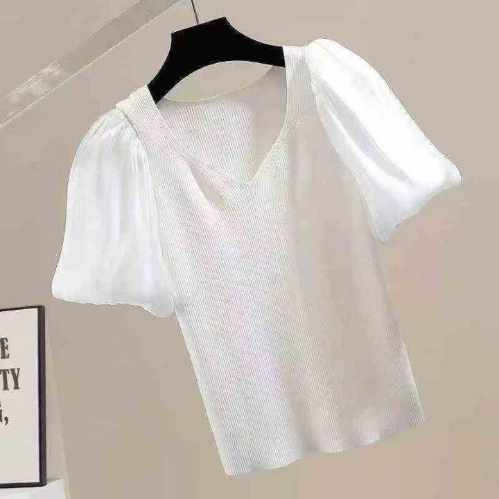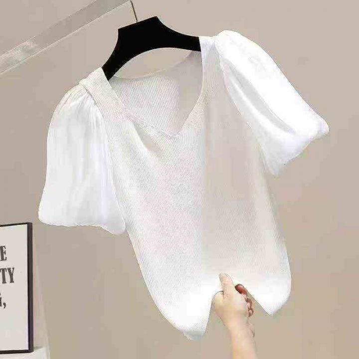 夏季新款法式复古v领雪纺拼接泡泡袖冰丝短袖针织小衫...