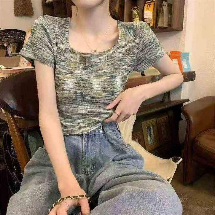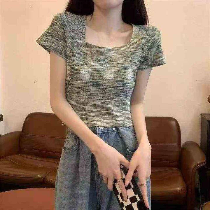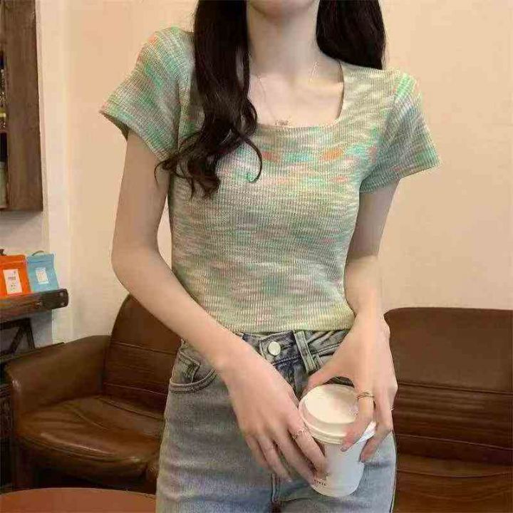 夏季新款撞色彩虹条纹网红爆款短袖针织衫,独立包装,...