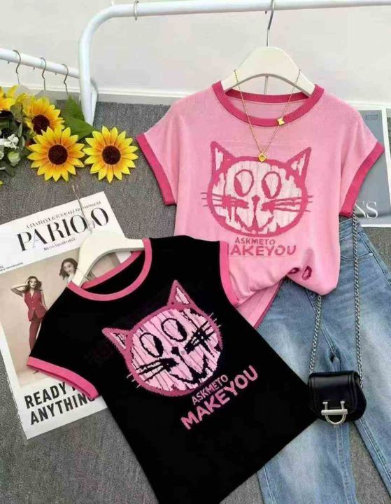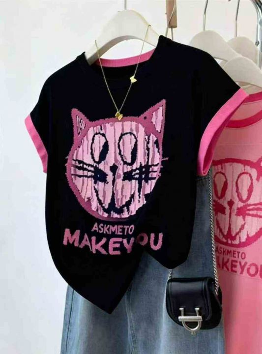 夏季新款时尚设计感拼色猫咪提花宽松慵懒风显瘦落肩针...