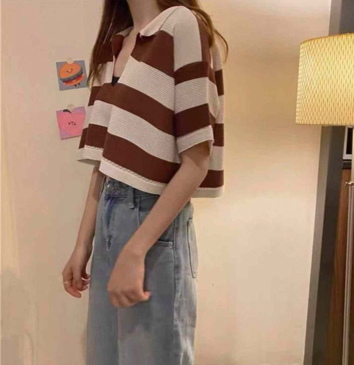 夏季新款撞色条纹宽松短款Polo领针织短袖,独立包装,...