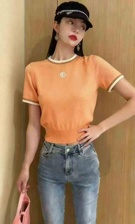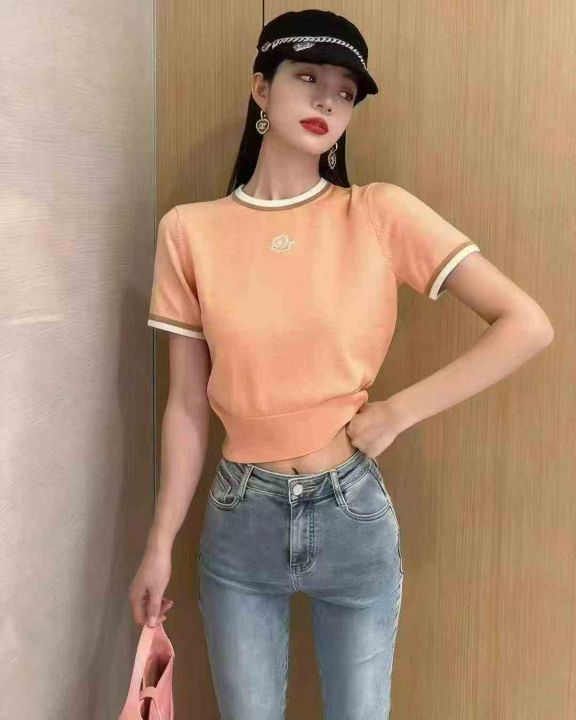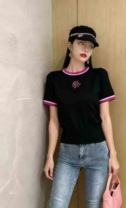 夏季新款撞色边玫瑰刺绣收腰显瘦针织短袖t桖,独立包装,均码面料柔软舒适弹力大,180件,全清6.9元超低价秒杀!